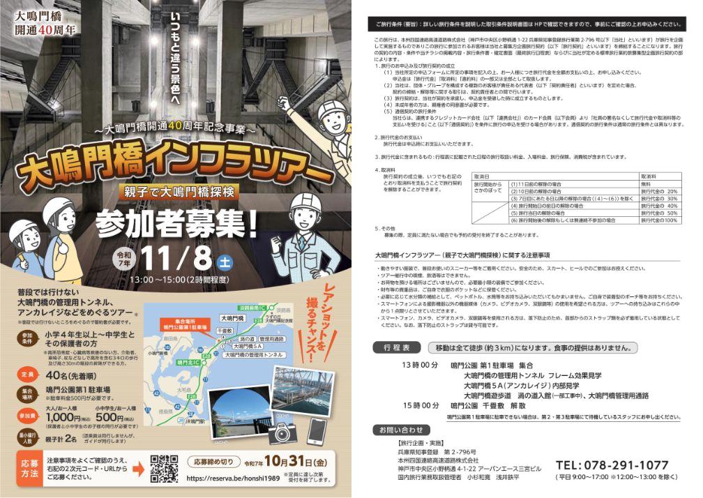 いつもと違う景色へ!本年、大鳴門橋は開通40周年を迎えます。記念して、親子で大鳴門橋を探検するインフラツアーを開催します。11月8日(土)13:00~15:00定員40名(先着順)普段は行けない大鳴門橋の管理用トンネル、アンカレイジなどをめぐるツアーです。レアショットを撮影できるチャンスです!お申込みは下記URLから!https://reserva.be/honshi1989