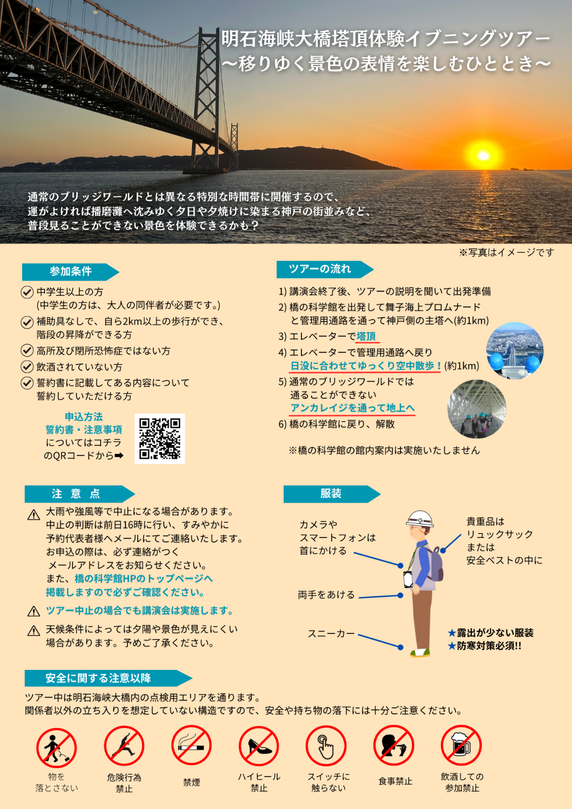 ※荒天時ツアー中止となる場合があります。中止の判断は前日16時に行い、すみやかに予約代表者様へメールにてご連絡いたします。また、橋の科学館ホームページにも掲載します。