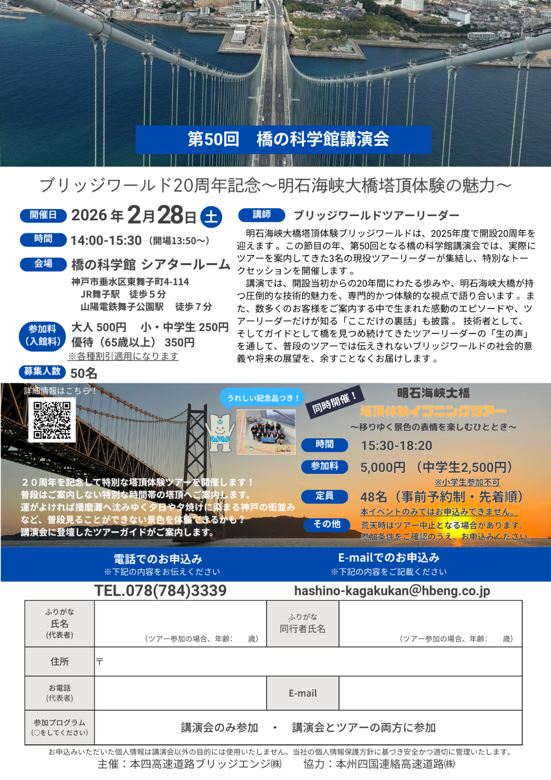 明石海峡大橋塔頂体験ツアーブリッジワールドは、2025年度で開設20周年を迎えます 。この節目の年、第50回となる橋の科学館講演会では、実際にツアーを案内してきた3名の現役ツアーリーダーが、特別なトークセッションを開催します 。