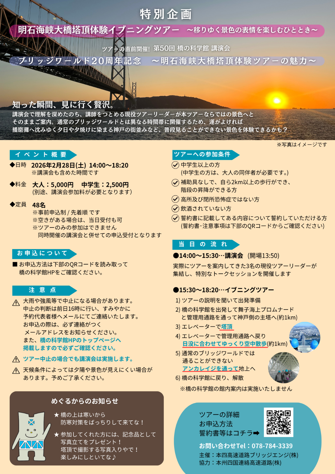 講演では、開設当初から20年間にわたる歩みや、明石海峡大橋が持つ圧倒的な技術的魅力、専門的かつ体験的な視点で語り合います。また、数多くのお客様をご案内する中で生まれた感動のエピソードや、ツアーリーダーだけが知る「ここだけの裏話」も披露。