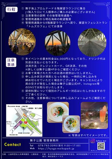 普段は入ることができない明石海峡大橋の管理用通路から明石海峡の眺望を鑑賞し、その後は舞子海上プロムナードから夜景と特別なディナーをぜひ堪能してみませんか♪