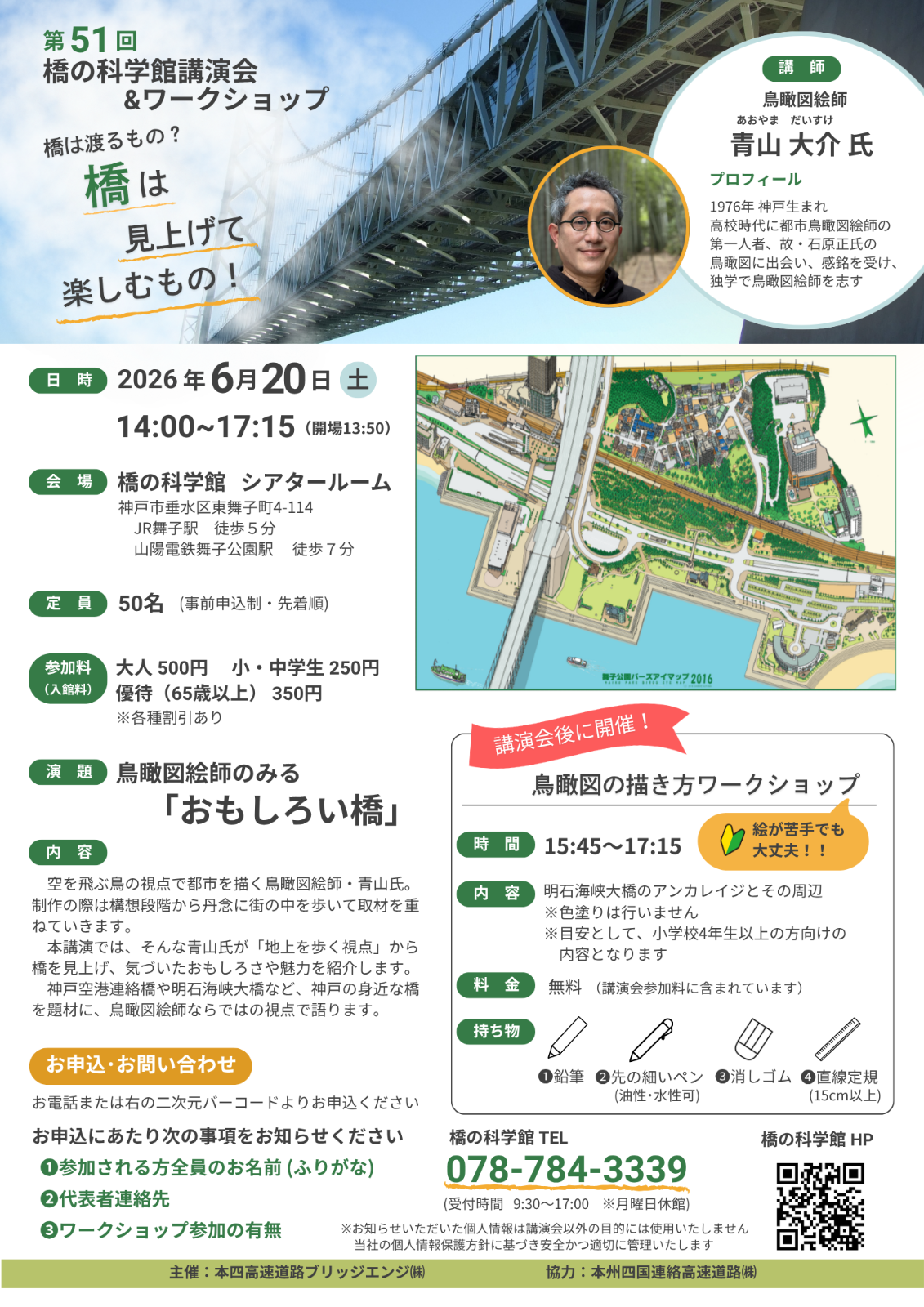 神戸空港連絡橋、神戸大橋、ポートライナー、灘~鷹取間の神戸市内線連続立体交差の高架橋、明石海峡大橋など、神戸の身近な橋を題材に、鳥瞰図絵師ならではの視点で語ります。